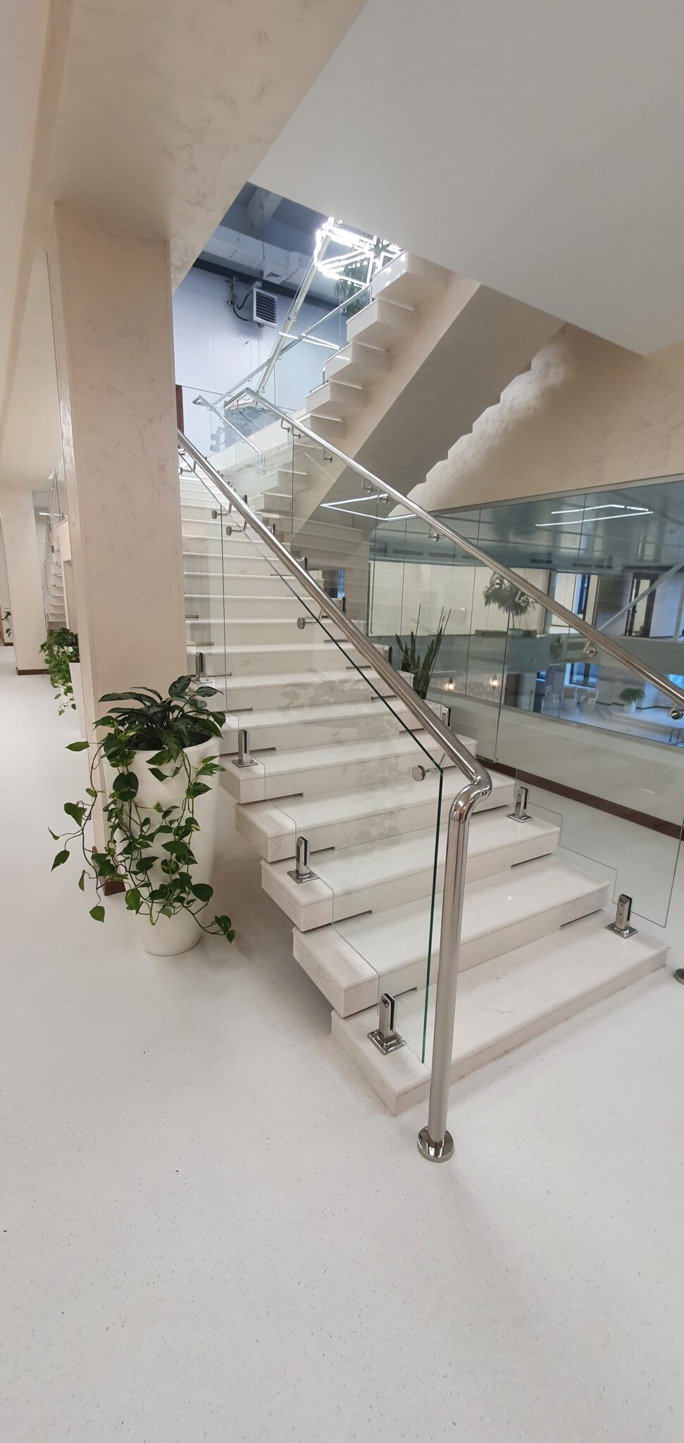 Ограждения и лестницы с закаленным стеклом и металлическим креплением. Зеркальные панели и зеркальные стены визуально расширяют пространство